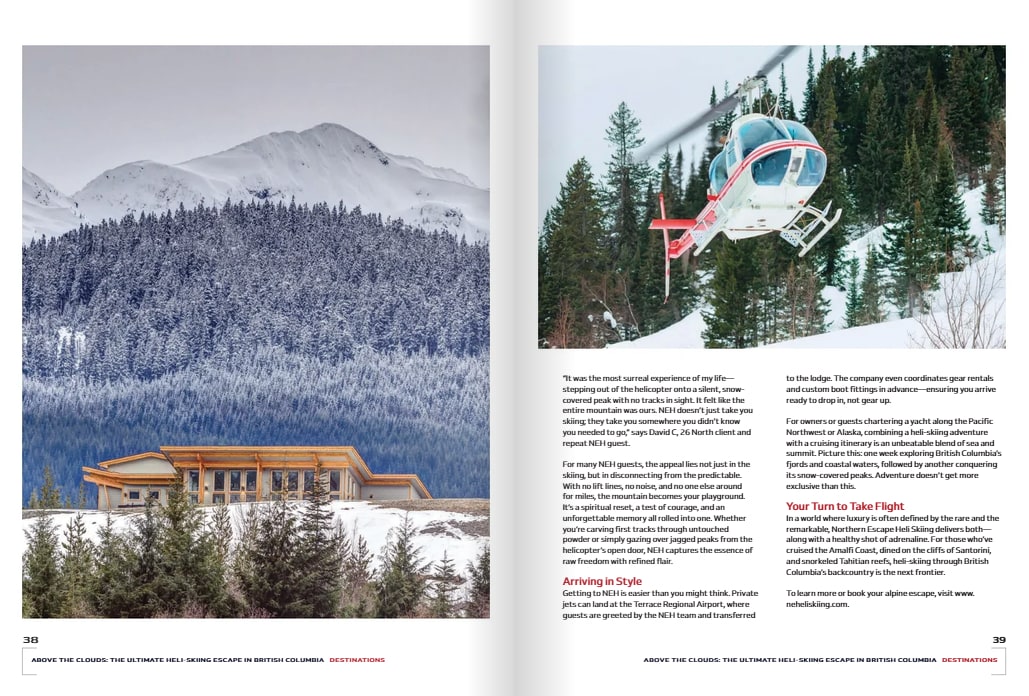 "In a world where luxury is often defined by the rare and the remarkable, Northern Escape Heli Skiing delivers both— along with a healthy shot of adrenaline. For those who’ve cruised the Amalfi Coast, dined on the cliffs of Santorini, and snorkeled Tahitian reefs, heli-skiing through British Columbia’s backcountry is the next frontier."